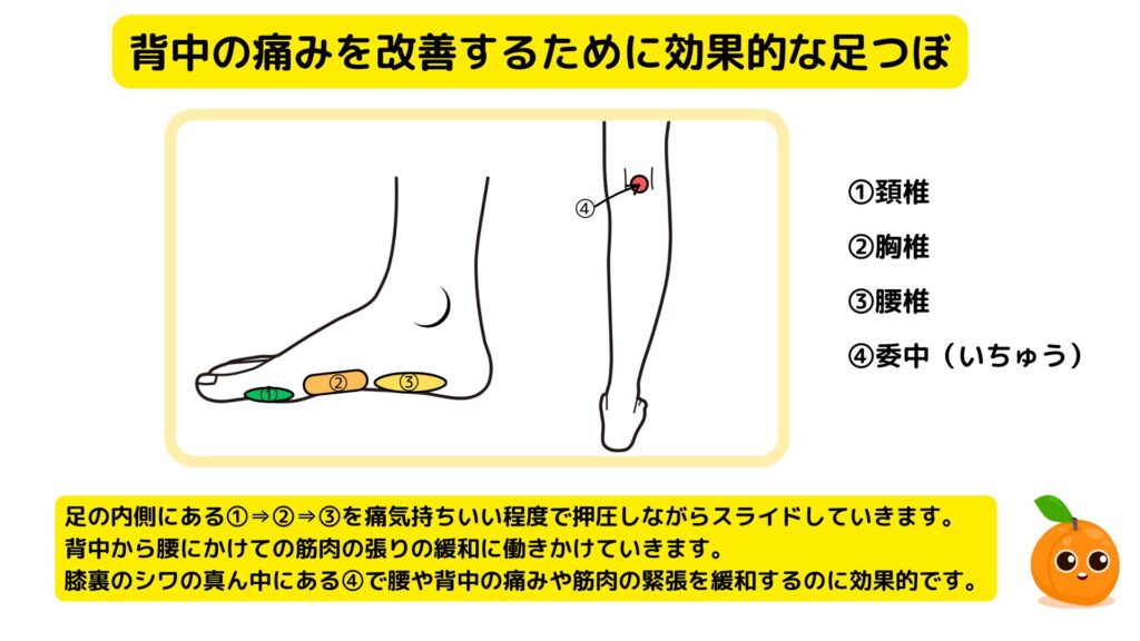 上記の足つぼで手から前腕、上腕、肩、肩甲骨までの筋肉の緊張を和らげた後に背中の痛みを改善していきましょう。