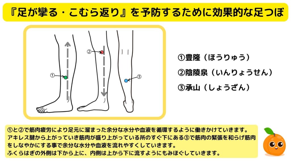 足先からの冷えを緩和した後にふくらはぎの筋収縮【足がつる・こむら返り】を予防するための足つぼを刺激していきます。