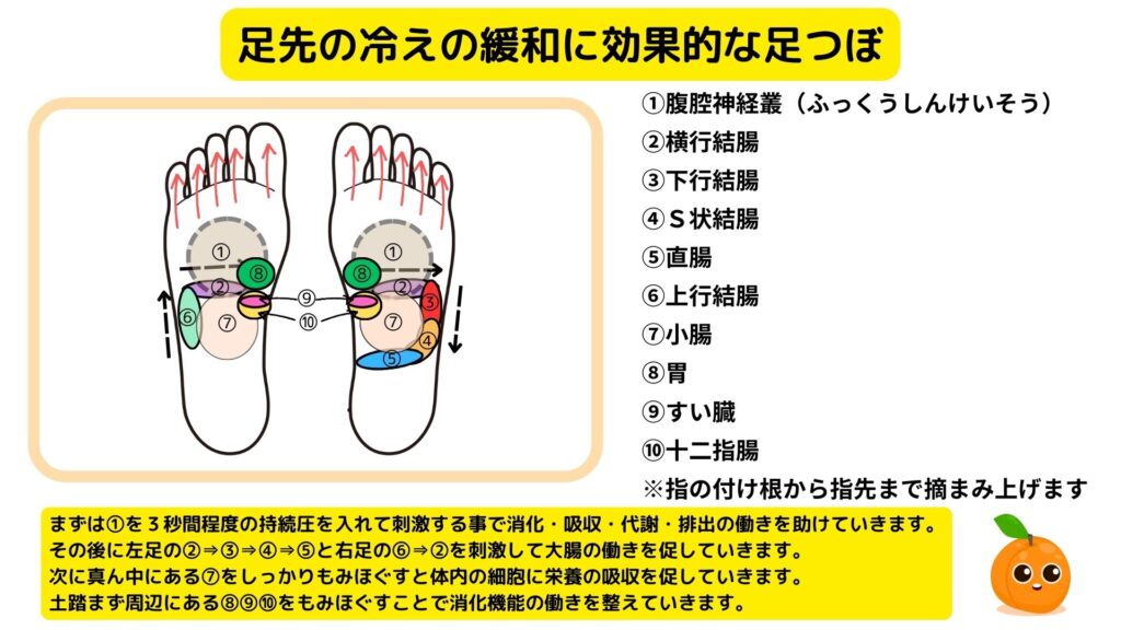 足裏中央よりやや上にある①腹腔神経叢の反射区で内臓の働きを助けていきます。