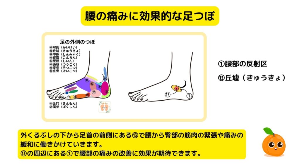 ①腰部の反射区と同じ所にある⑬丘墟(きゅうきょ)で腰の痛みを改善するために働きかけていきます。