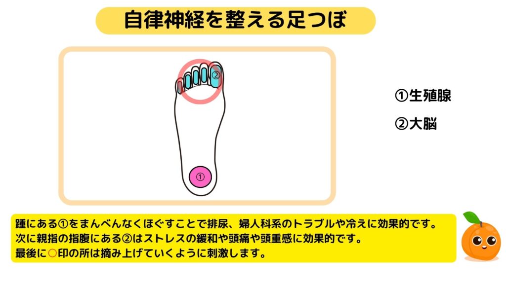 踵にある①生殖腺の反射区で泌尿器系や冷え、ストレスの緩和に期待できます。